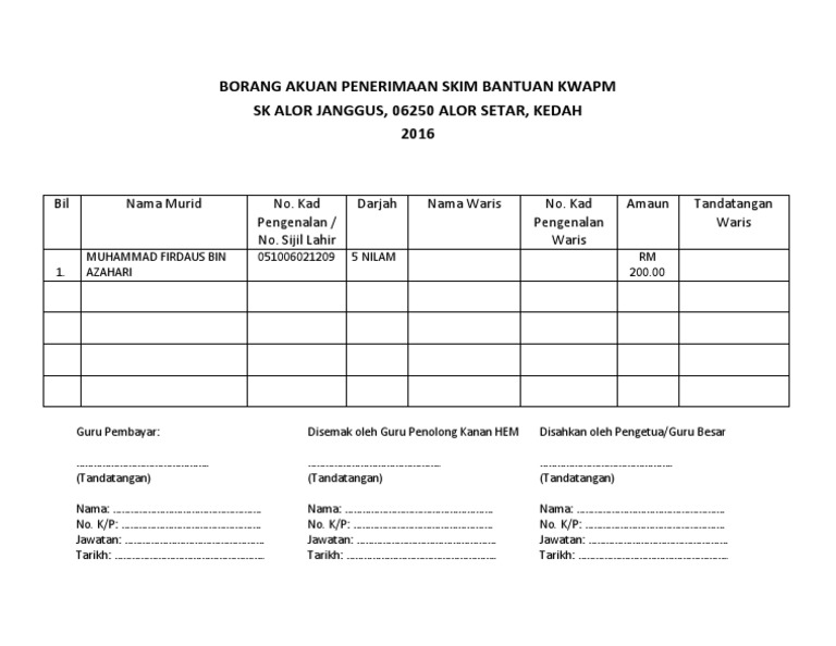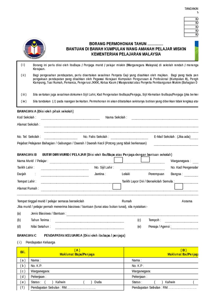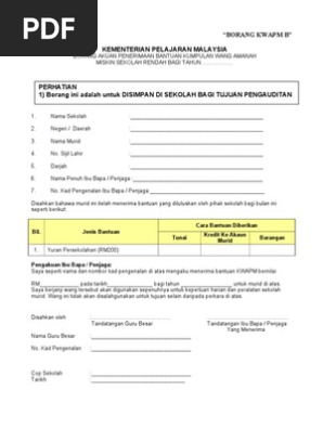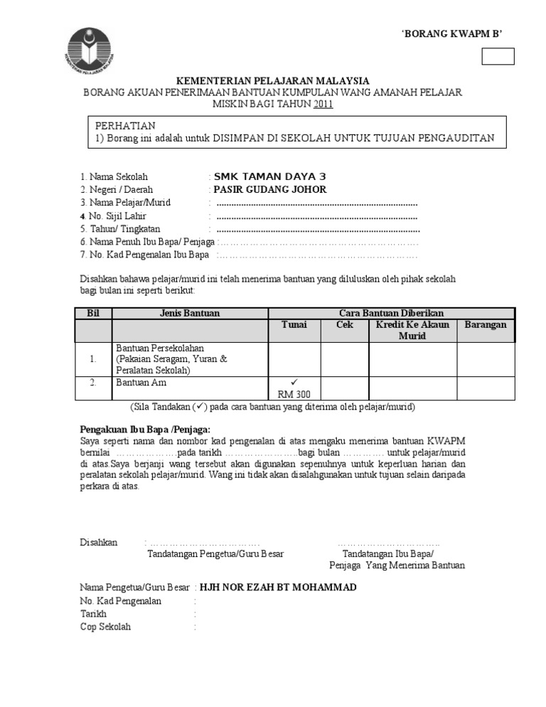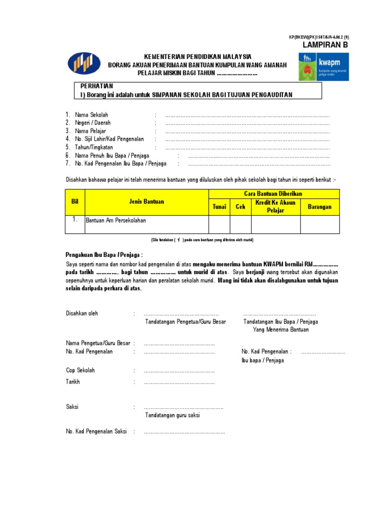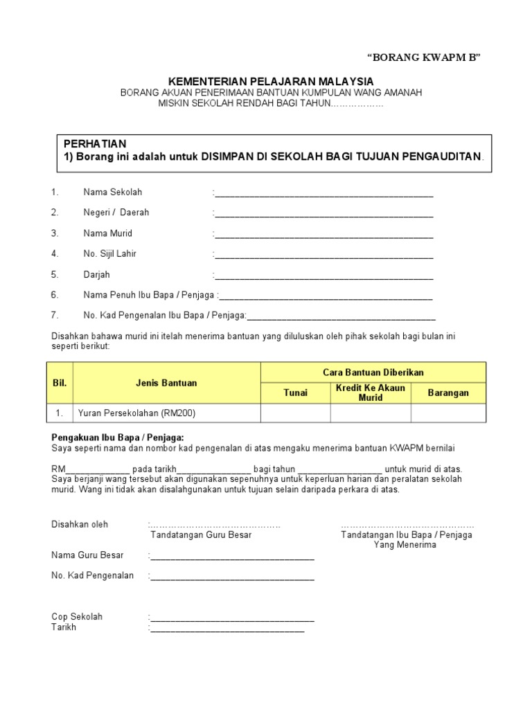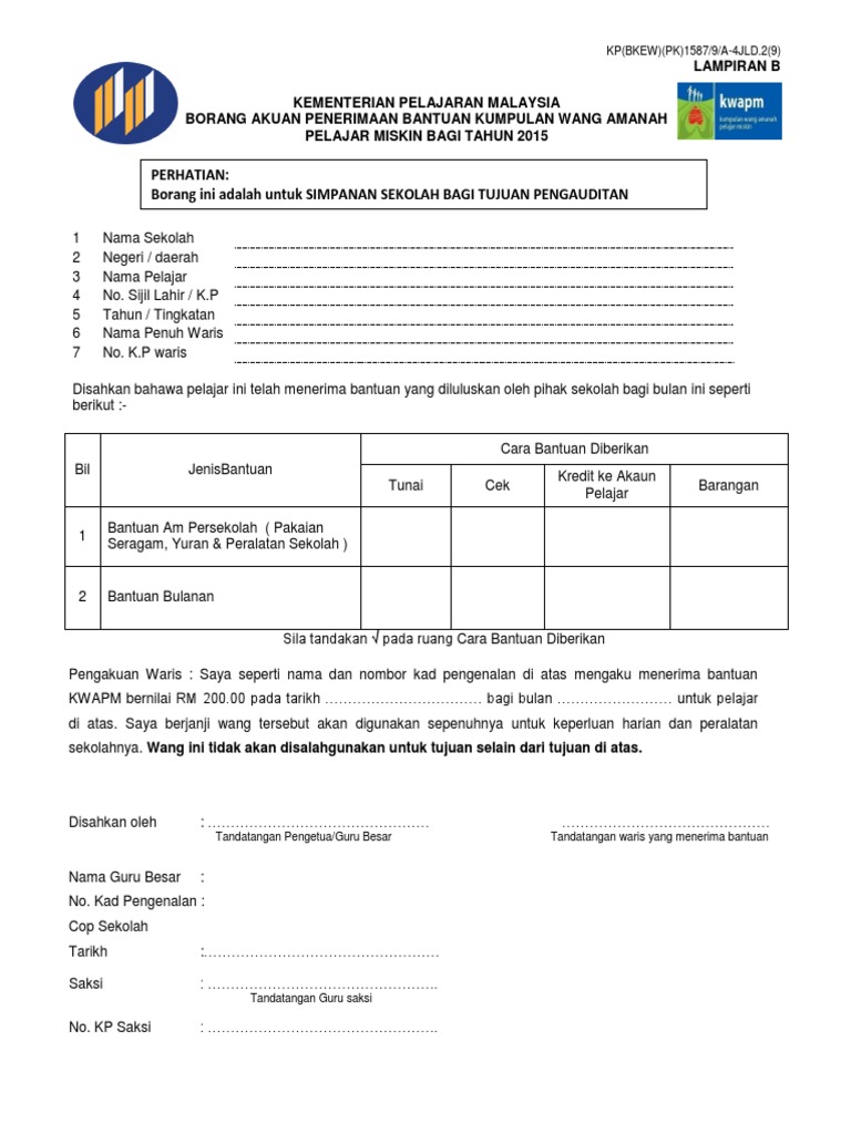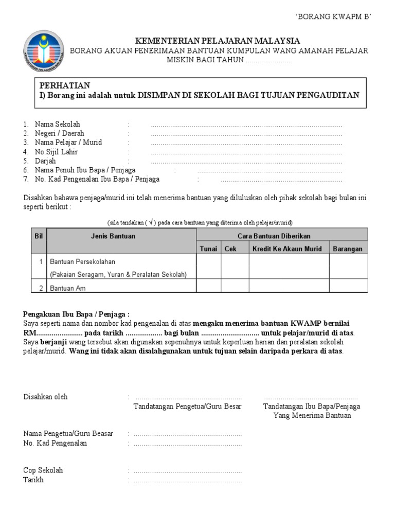 Borang di atas digunakan oleh pihak sekolah untuk menentukan sama ada pelajar layak mendapat Bantuan Awal Persekolahan KWAPM atau biasiswa. Penafian Bahan yang portalamalaysia kongsikan dihalaman ini sekadar tutorial dan rujukan ringkasan yang berkaitan dengan Bantuan Khas Kumpulan Wang Amanah Pelajar. Lampiran 1 borang pemantauan pengagihan peruntukan bantuan kumpulan wang amanah pelajar miskin kwapm ekasih bagi negeri sarawak bayaran bil murid bayaran bayaran bb jumlah.