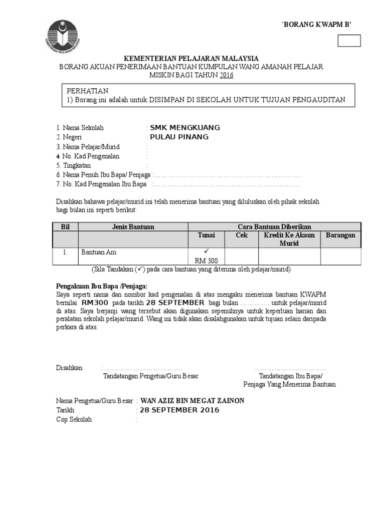 . Panduan buat murid Sekolah. Jenis Dan Kadar Bantuan KWAPM. Pdf Borang Permohonan Bantuan KWAPM 2017 pdf 535 KB 2143 muat turun Popular.