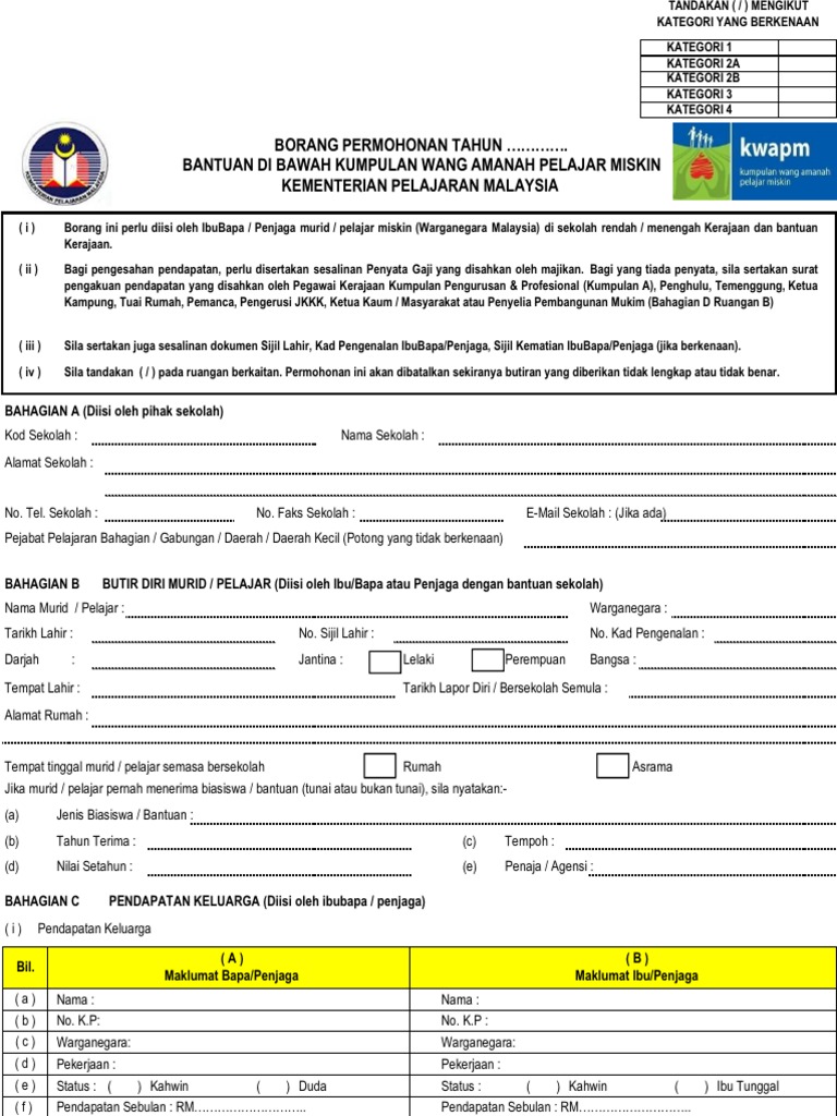 Tiga Jenis Bantuan KWAPM. Borang ini perlu dikemukakan oleh ibu bapapenjaga bagi permohonan. Permohonan Bantuan Kumpulan Wang Amanah Pelajar Miskin KWAPM selagi lagi dibuka untuk murid-murid yang berkelayakan.