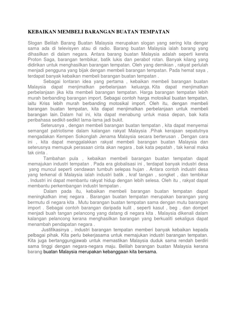 Faedah Membeli Barangan Buatan Malaysia. Sebagaimana yang kita ketahui barangan import lazimnya lebih mahal daripada barangan buatan tempatan. Karangan Bahasa Melayu SPMPT3.